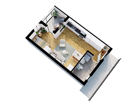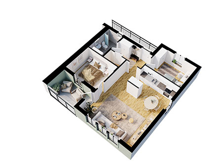 Samtliga lägenheter har balkonger. Lägenheterna utrustas med en kombimaskin i ettorna och tvåorna och separat tvättmaskin och torktumlare i treorna. Diskmaskin finns i alla lägenheter.
