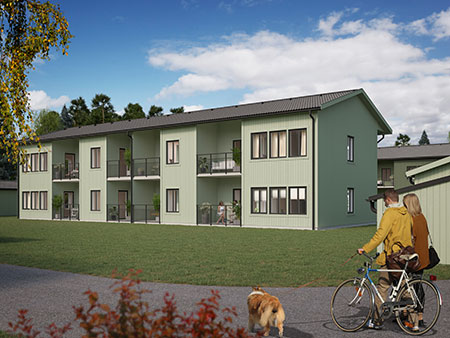 De nya flerfamiljshusen byggs i trä. Det blir fem tvåvåningshus med loftgång. Totalt 40 lägenheter fördelat på ettor, tvåor och treor.